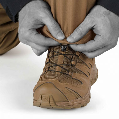 Проденьте ремень через двойные петли, усиленные CORDURA® (это поможет избежать провисания ремня под нагрузкой). Затем используйте крючок внизу каждой штанины, чтобы зафиксировать брюки у ботинок и предотвратить подъём ткани.