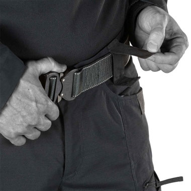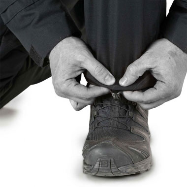 Проденьте ремень через двойные петли, усиленные CORDURA® (это поможет избежать провисания ремня под нагрузкой). Затем используйте крючок внизу каждой штанины, чтобы зафиксировать брюки у ботинок и предотвратить подъём ткани.